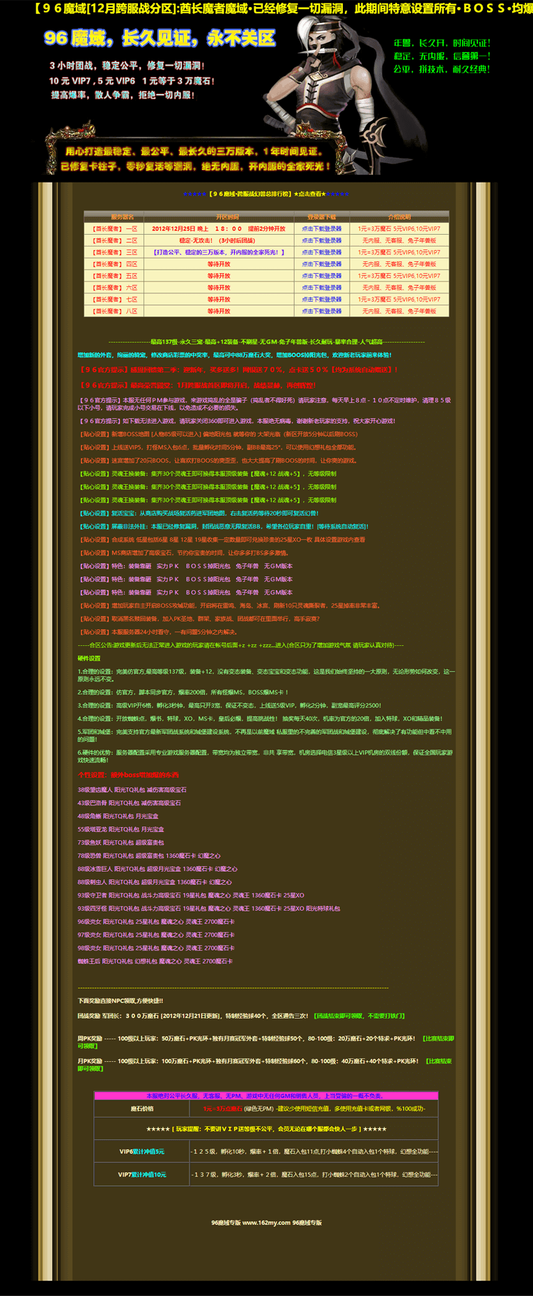 【96官方提示】本服无任何PM参与游戏,来游戏捣乱的全是骗子(捣乱者不得好死)请玩家注意,每天早上8点-10点不定时维护,清理85级以下小号,请玩家完成小号交易在下线,以免造成不必要的损失。