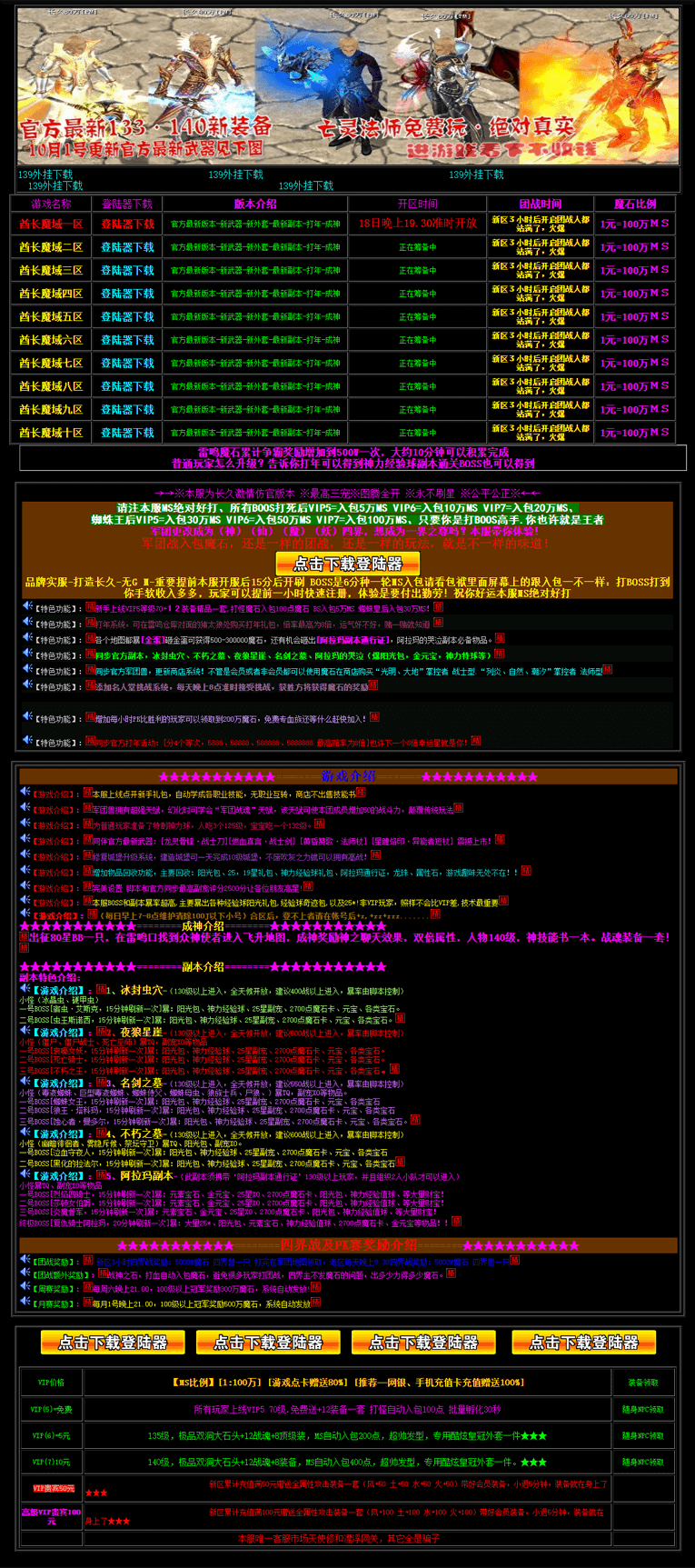 1【特色功能】:1新手上线VIP5等级70+12装备精品一套,打怪魔石入包100点魔石 BS入包5万MS 蜘蛛皇后入包30万MS!1