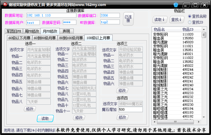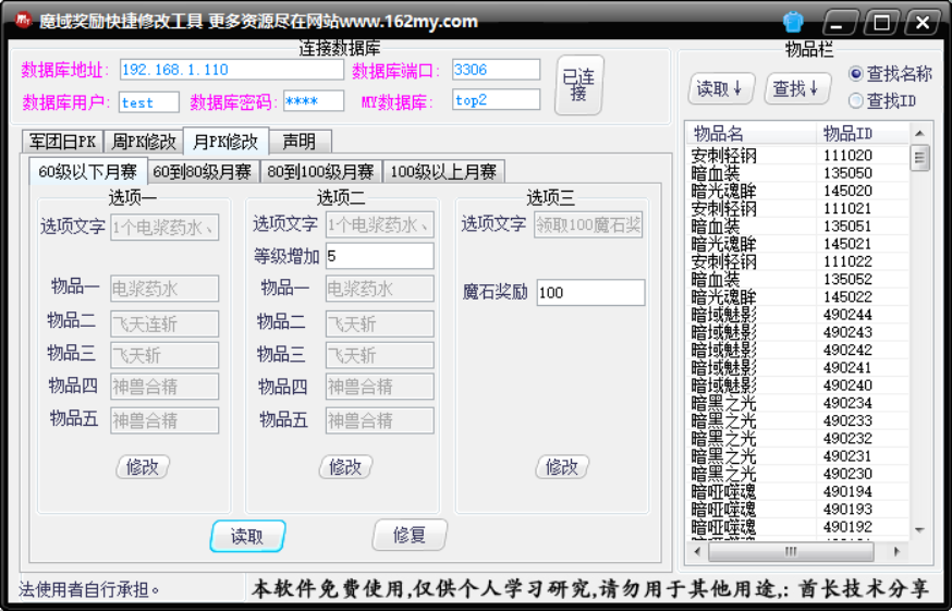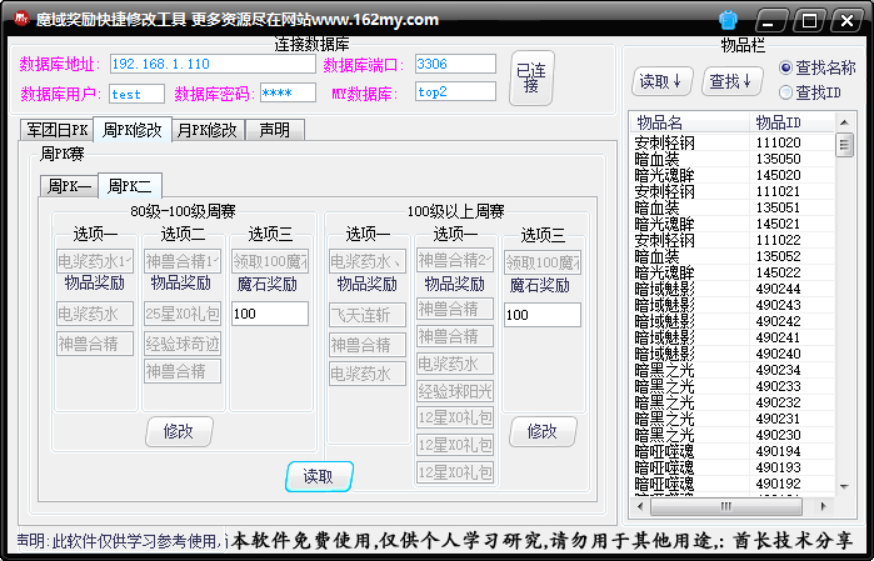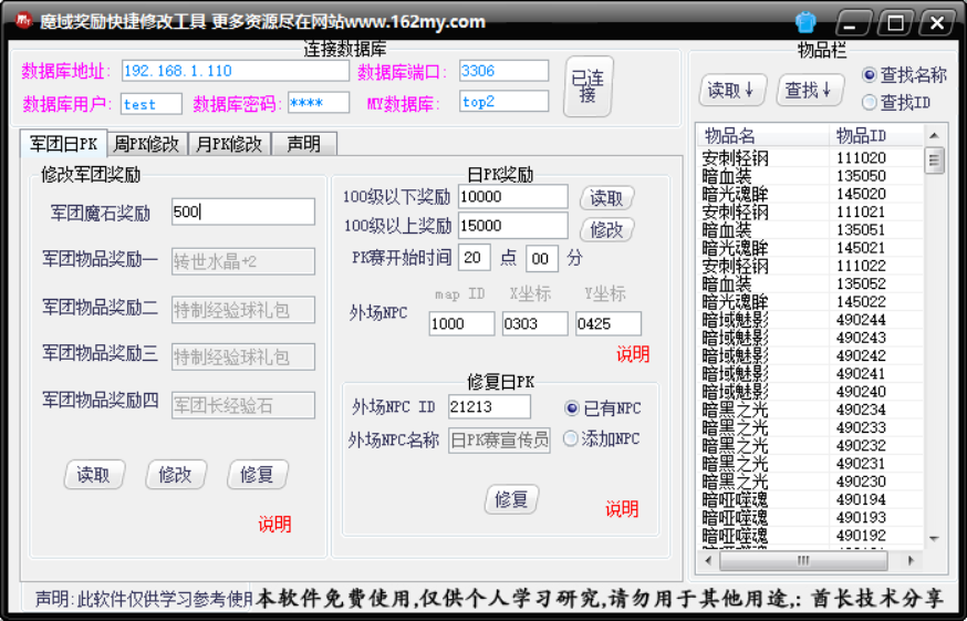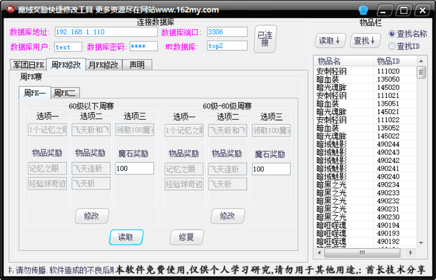 魔域私服军团奖励修改,魔域私服周PK赛奖励修改,魔域私服月PK赛奖励修改,工具简单易懂酋长技术分享魔域私服各种奖励修改修复软件,魔域私服架设视频教程,修改教程语音,局域网,外网架设修改教程,魔域服务端,魔域版本